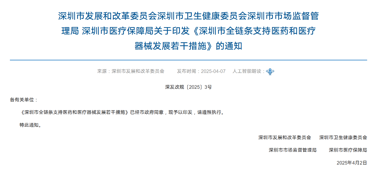“摘要:4月7日,深圳市发展改革委、卫生健康委、市场监管局、医保局等4部门联合印发《深圳市全链条支持医药和医疗器械发展若干措施》(深发改规〔2025〕3号,以下简称《若干措施》)。