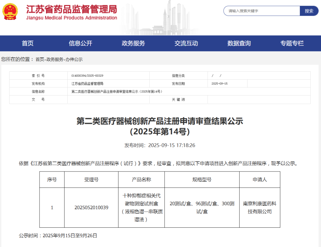 9月15日,江苏省药品监督管理局发布《第二类医疗器械创新产品注册申请审查结果公示(2025年第14号)》,宣布经审查,拟同意南京利康医药科技有限公司研发的 “十种抑郁症相关代谢物测定试剂盒(液相色谱—串联质谱法)” 进入创新产品注册程序,目前已正式开启公示。
