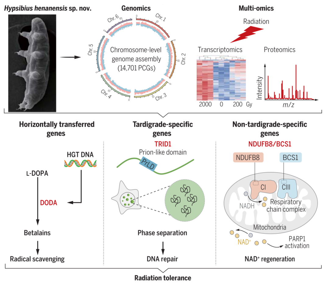 2024年10月25日,国家蛋白质科学中心(北京)张令强等团队合作在Science发表了题为“Multi-omics landscape and molecular basis of radiation tolerance in a tardigrade”的研究论文,报道了一种高生属新种——河南高生熊虫,并建立了其实验室培养体系,绘制了高质量基因组图谱,在国际上首次整合转录组、蛋白质组响应超强辐射的动态变化及分子进化和功能特征分析,揭示了河南高生熊虫耐受超强辐射的三类机制,并分别对代表性关键分子进行了深入的功能和机制研究。