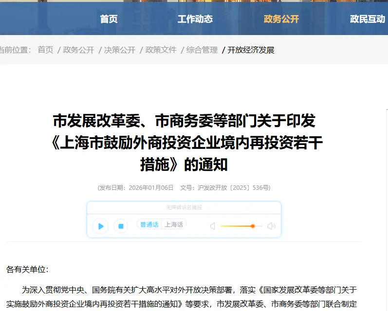 1月6日,上海市发展改革委、市商务委等多部门联合印发《上海市鼓励外商投资企业境内再投资若干措施》,推出二十项针对性政策,旨在深入落实国家扩大高水平对外开放部署,更大力度吸引和利用外资,推动外商投资企业在沪持续扩大投资、优化发展。