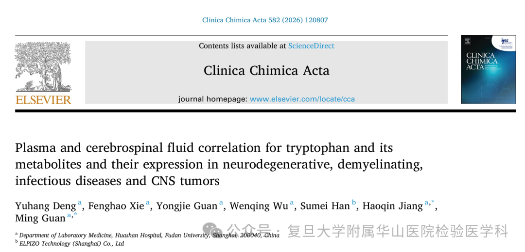 1、近日,复旦大学附属华山医院检验医学科在 Clinica Chimica Acta杂志上发表了一项基于真实临床人群的系统研究“Plasma and cerebrospinal fluid correlation for tryptophan and its metabolites and their expression in neurodegenerative, demyelinating, infectious diseases and CNS tumors”。该研究基于大样本、同步采集的血浆–脑脊液配对样本,应用所建立的LC-MS/MS多指标定量检测方法,系统评估了色氨酸、血清素、5-羟基吲哚乙酸、褪黑素及犬尿喹啉酸在不同神经系统疾病中的表达特征和在外周和中枢系统间的相关性。研究结果表明,血浆中色氨酸代谢物水平难以准确反映其在脑脊液中的真实变化,而脑脊液在揭示中枢神经系统疾病,尤其是中枢神经系统肿瘤相关代谢改变方面具有更高的信息价值。本文第一作者为复旦大学附属华山医院检验医学科邓宇航博士,通讯作者为检验医学科关明教授及蒋浩琴教授,共同负责研究设计、数据解读与论文修订工作。