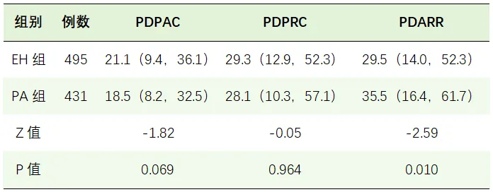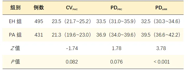 注:EH为原发性高血压;PA为原发性醛固酮增多症;PD为差异百分比;PAC为血浆醛固酮浓度;PRC为血浆肾素浓度;ARR为醛固酮/肾素比值
