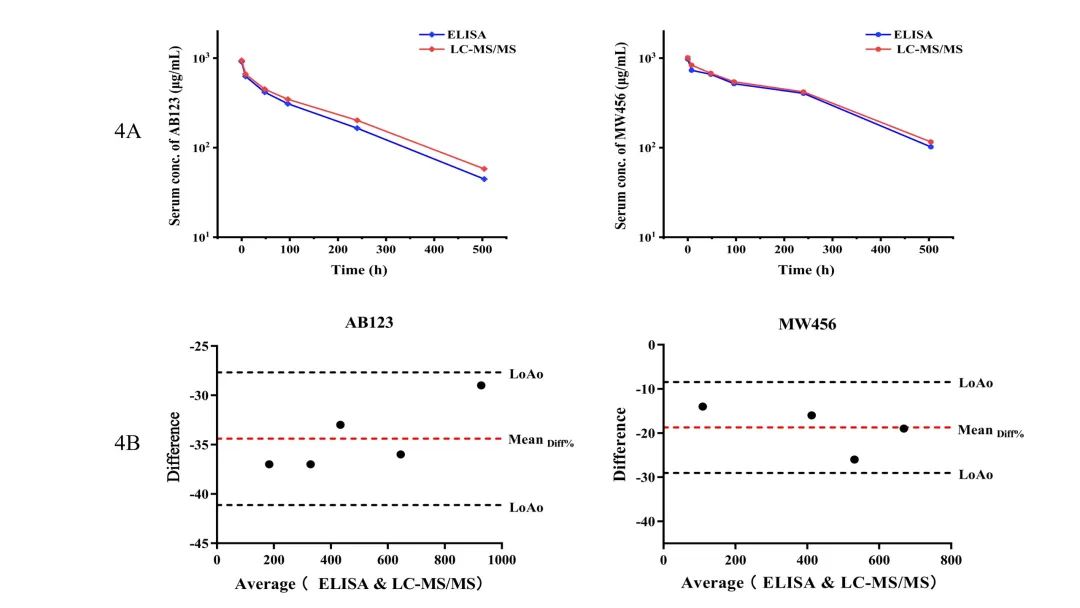 图2. 4A分别展示了AB123(左)和MW456(右)采用LC-MS/MS法(红色)与相关ELISA检测(蓝色)获得的PK曲线。4B通过Bland-Altman分析比较了LC-MS/MS法与 ELISA 测得的AB123(左)和MW456(右)药物浓度。红色虚线表示平均差异,蓝色虚线表示95%一致性界限