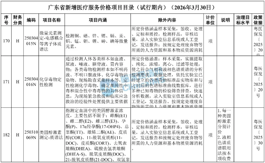 在广东省新增医疗服务价格目录中总共新增项目192项,涉及质谱法新增项目3项,包括微量元素测定-电感耦合等离子体质谱法、化学毒物定性检测、类固醇激素测定-质谱法。相比2025年发布的征求意见稿新增2项,详情见下表: