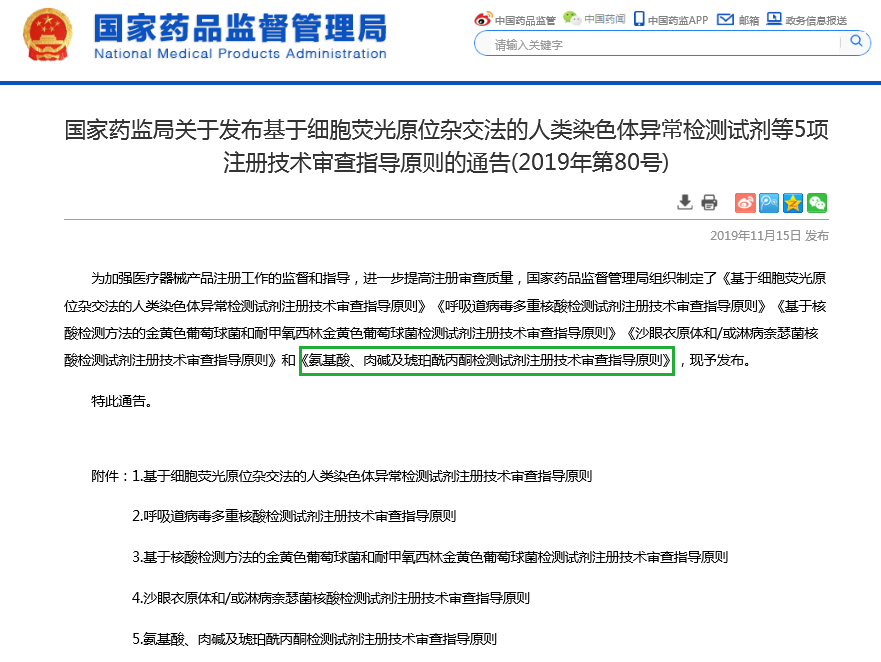 为加强医疗器械产品注册工作的监督和指导,进一步提高注册审查质量,国家药品监督管理局组织制定了五项注册技术审查指导原则,并于2019年11月15日进行发布。其中一项为串联质谱法《氨基酸、肉碱及琥珀酰丙酮检测试剂注册技术审查指导原则》。