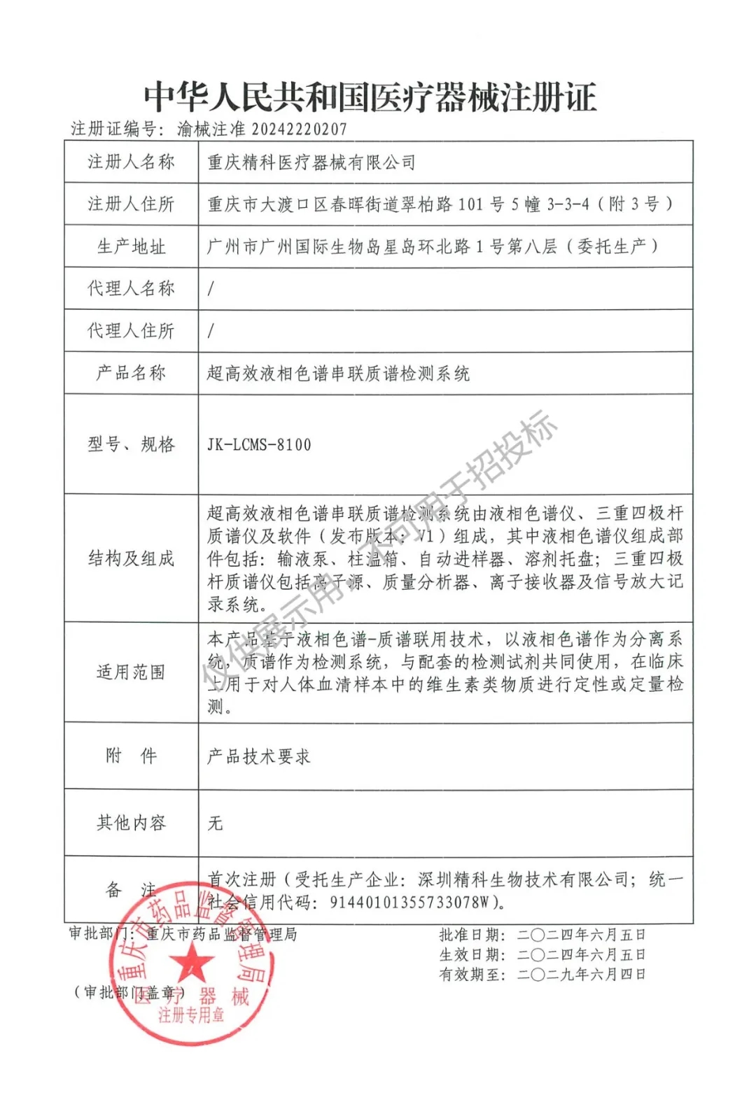 2024年6月5日,精科生物技术集团子公司重庆精科医疗器械有限公司“超高效液相色谱串联质谱检测系统(型号:JK-LCMS-8100 )”正式取得重庆市药品监督管理局颁发的第二类医疗器械注册许可证,获准上市。