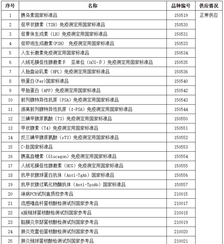 注:1.*标识品种为本期目录新增体外诊断试剂标准物质。2.▲标识品种为可用于体外诊断试剂检验的化学对照品。3.相关品种电子版说明书可到中国食品药品检定研究院网站http://aoc.nifdc.org.cn/sell/home/search.html,点击目录查询,进行在线浏览。4.限制供应是指仅供给相关体外诊断试剂生产企业。5.《注册检验用体外诊断试剂国家标准品和参考品目录(第十六期)》发布之日起,《注册检验用体外诊断试剂国家标准品和参考品目录(第十五期)》同时废止。