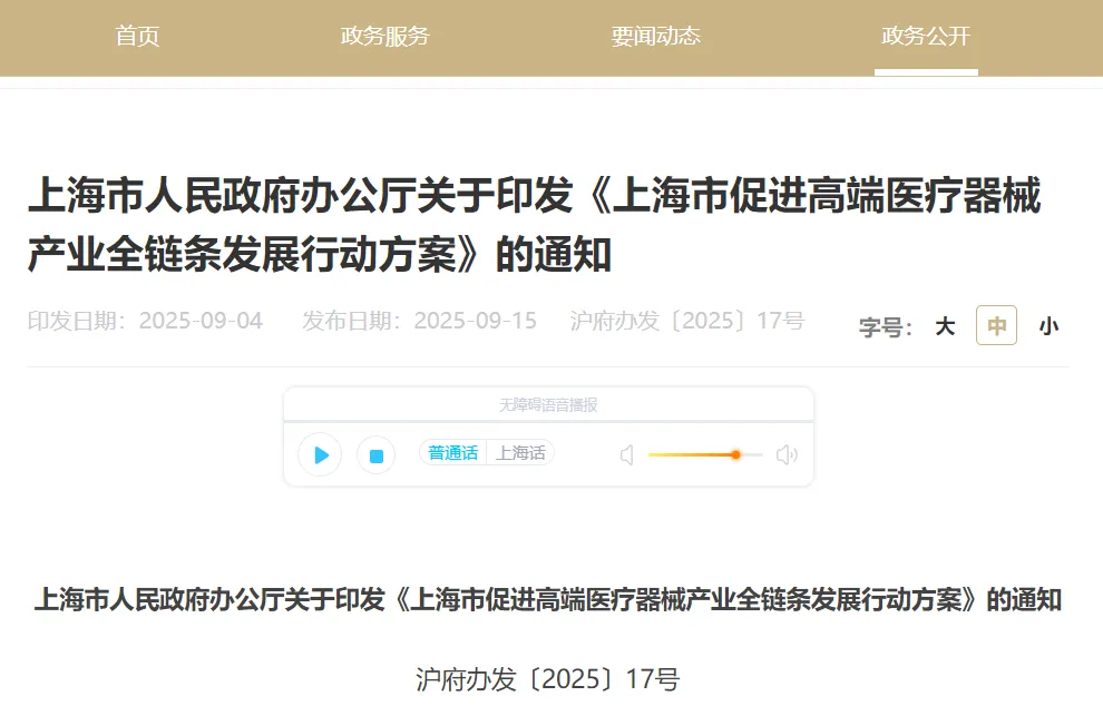 9月15日,上海市人民政府办公厅发布关于印发《上海市促进高端医疗器械产业全链条发展行动方案》的通知。