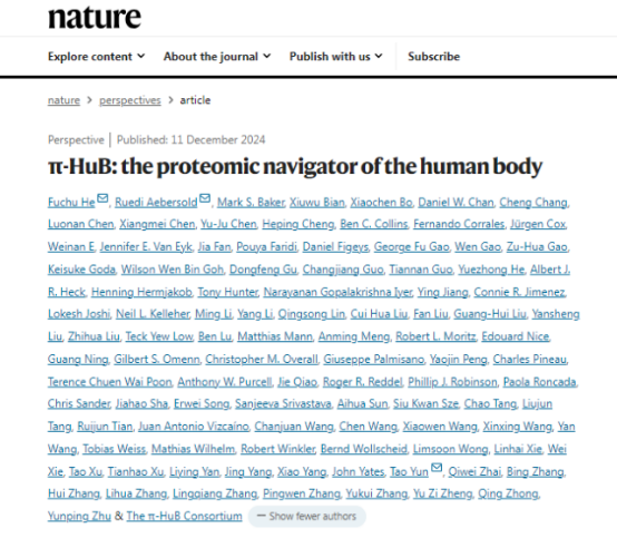 2024年12月11日, Nature在线发布了中国科学家领衔发起、十八位两院院士和十八国科学家团队联合署名的人体蛋白质组导航国际大科学计划(Proteomic Navigator of the Human Body,简称“π-HuB”计划)白皮书,标志着该计划在重大科学问题凝练和全球合作共识凝聚方面取得重大突破,其主要科学目标和实施路径被国际主流科技界正式认可。