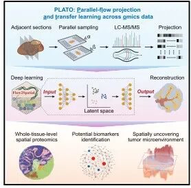 2025年1月23日,中国科学院动物研究所的赵方庆团队在Cell发表了题为“High-resolution spatially resolved proteomics of complex tissues based on microfluidics and transfer learning”的研究论文,提出了全新的空间蛋白组学技术框架——PLATO,通过整合人工智能深度学习算法与微流控技术,实现了全组织切片水平的高分辨率空间蛋白质组检测(25微米分辨率,数千个蛋白),突破了高通量原位组学技术的瓶颈。