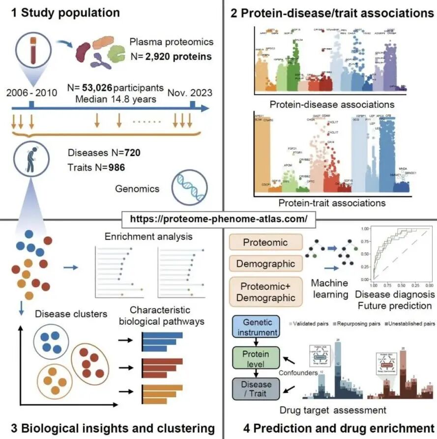 2024年11月22日,复旦大学附属华山医院的郁金泰等团队合作在Cell上发表了题为“Atlas of the plasma proteome in health and disease in 53,026 adults”的研究论文,全面绘制了人类健康与疾病蛋白质组图谱,并结合人工智能大数据分析方法构建了疾病诊断预测模型以及发现了26个药物治疗新靶点,为精准医学的实施提供了重要科学依据。