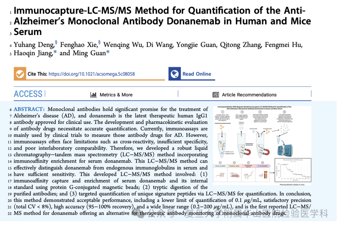 2、华山医院复旦大学附属医院检验医学科在国际期刊ACS Omega上发表研究论文“Immunocapture-LC-MS/MS Method for Quantification of the Anti-Alzheimer’s Monoclonal Antibody Donanemab in Human and Mice Serum”,系统建立并验证了一种用于阿尔茨海默病(AD)治疗性单克隆抗体多奈单抗(Donanemab)的高特异性定量检测新方法。本研究第一作者为邓宇航博士与谢风浩硕士研究生,通讯作者为关明教授和蒋浩琴教授。
