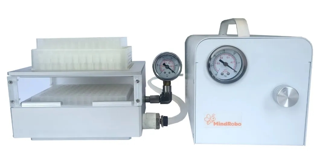 负压提取仪(负压固相萃取装置)同正压提取仪原理相反,是一种基于负压驱动的高通量样品提取设备,其工作原理是通过上盖组件和底座组件形成一个密闭腔体,将提取柱或96孔提取板放置于上盖组件上的限位块限制区域。此时使用真空泵经由气管接头处向外抽气,则密闭腔体内部形成负压,而外侧为正压,内外压力差可使提取柱或96孔提取板内液体流下,进而完成提取或过滤过程。