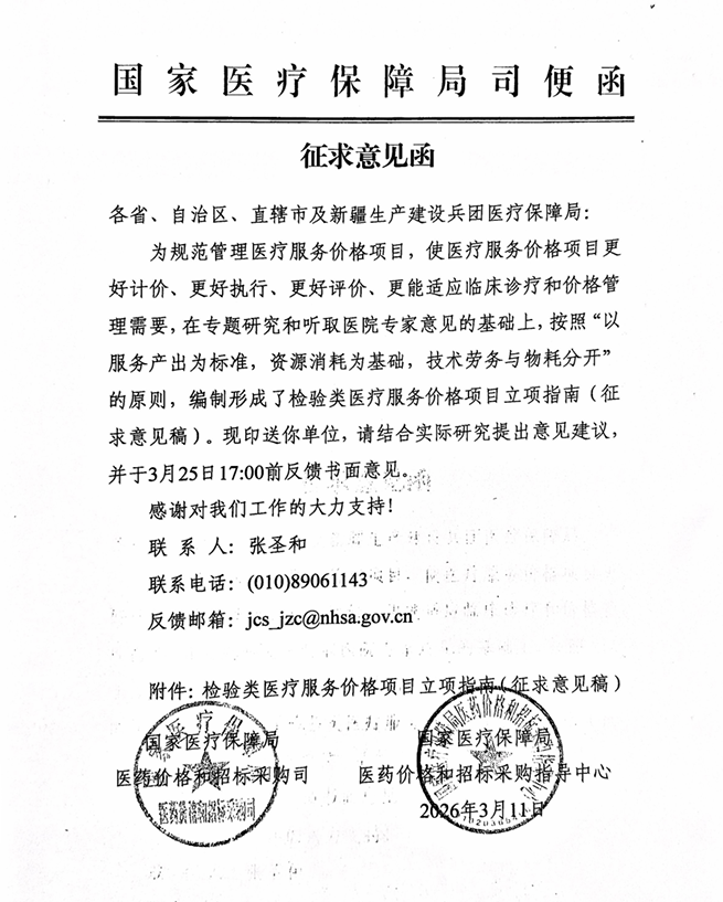 3月11日,国家医保局发布《检验类医疗服务价格项目立项指南(征求意见稿)》,指南按照“以服务产出为标准,资源消耗为基础,技术劳务与物耗分开”的原则编制形成。意见征集截止日期为3月25日17点前。
