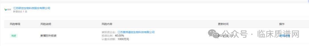 3月25日,据企查查消息,江苏硕世生物与苏州颐坤生物共同投资,设立了江苏奥特谱创生物科技有限公司,注册资本1000万,其中硕世生物占比40%!