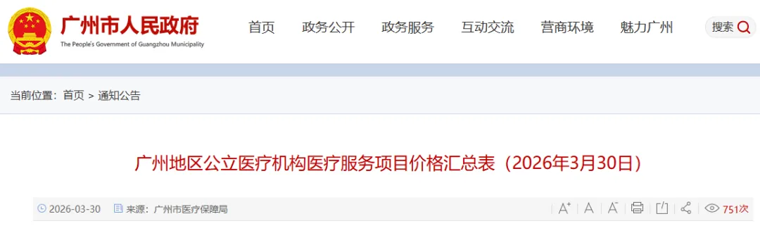 3月30日,广州市政府官网发布《广州地区公立医疗机构医疗服务项目价格汇总表(2026年3月30日)》。文件包含广州地区基本医疗服务价格项目目录,广州地区立项指南项目价格目录、广东省市场调节价医疗服务价格目录、广东省新增医疗服务价格项目目录等5个附件。